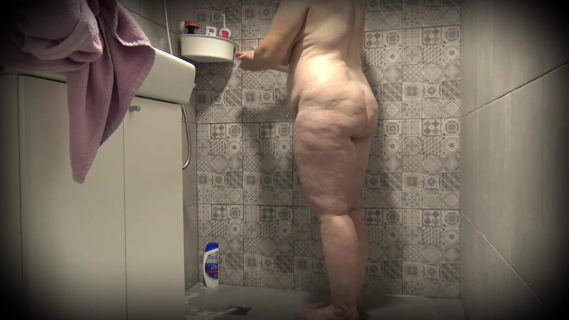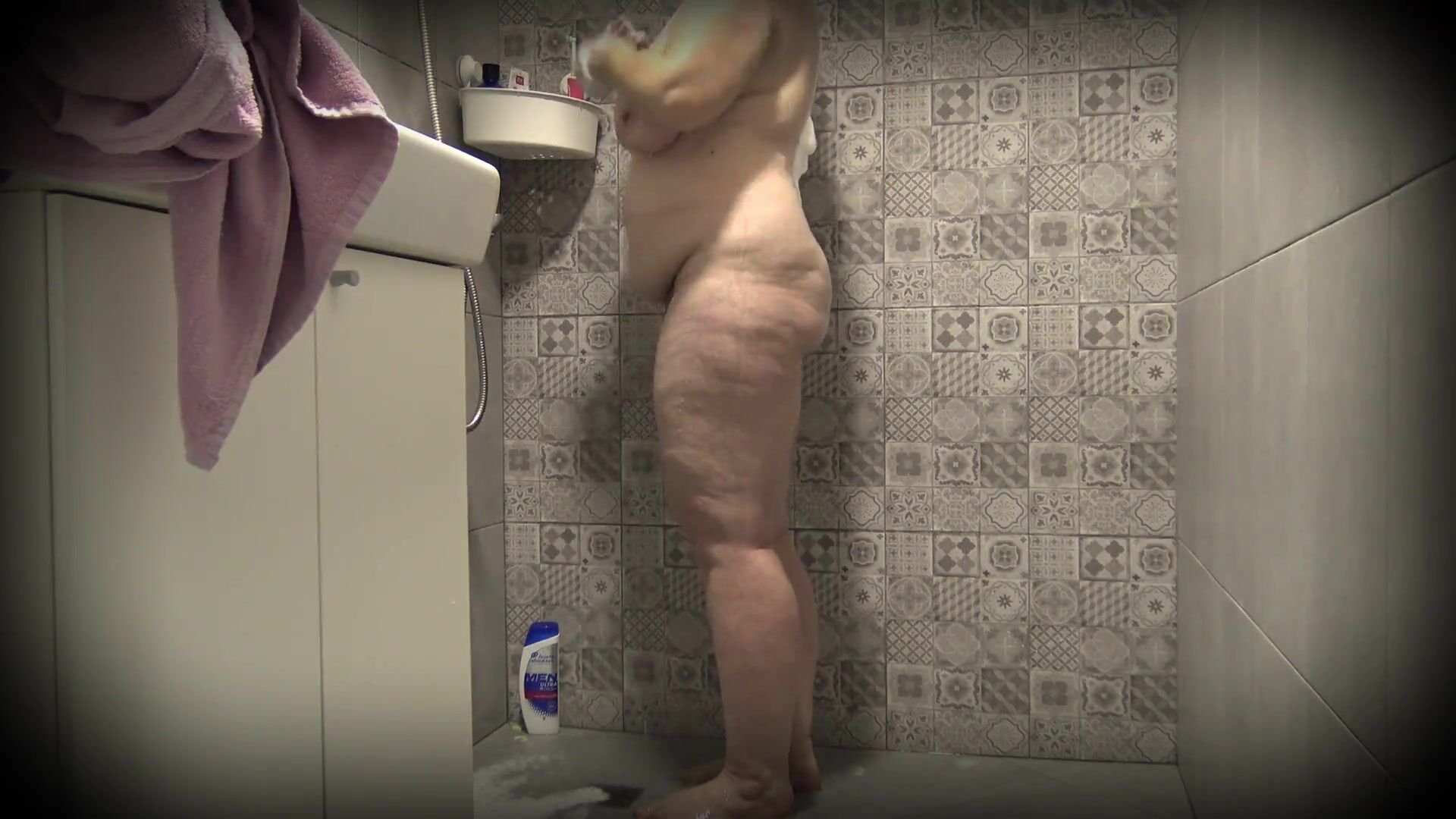 MATURE BUSTY FAT MILF TAKES A SHOWER.