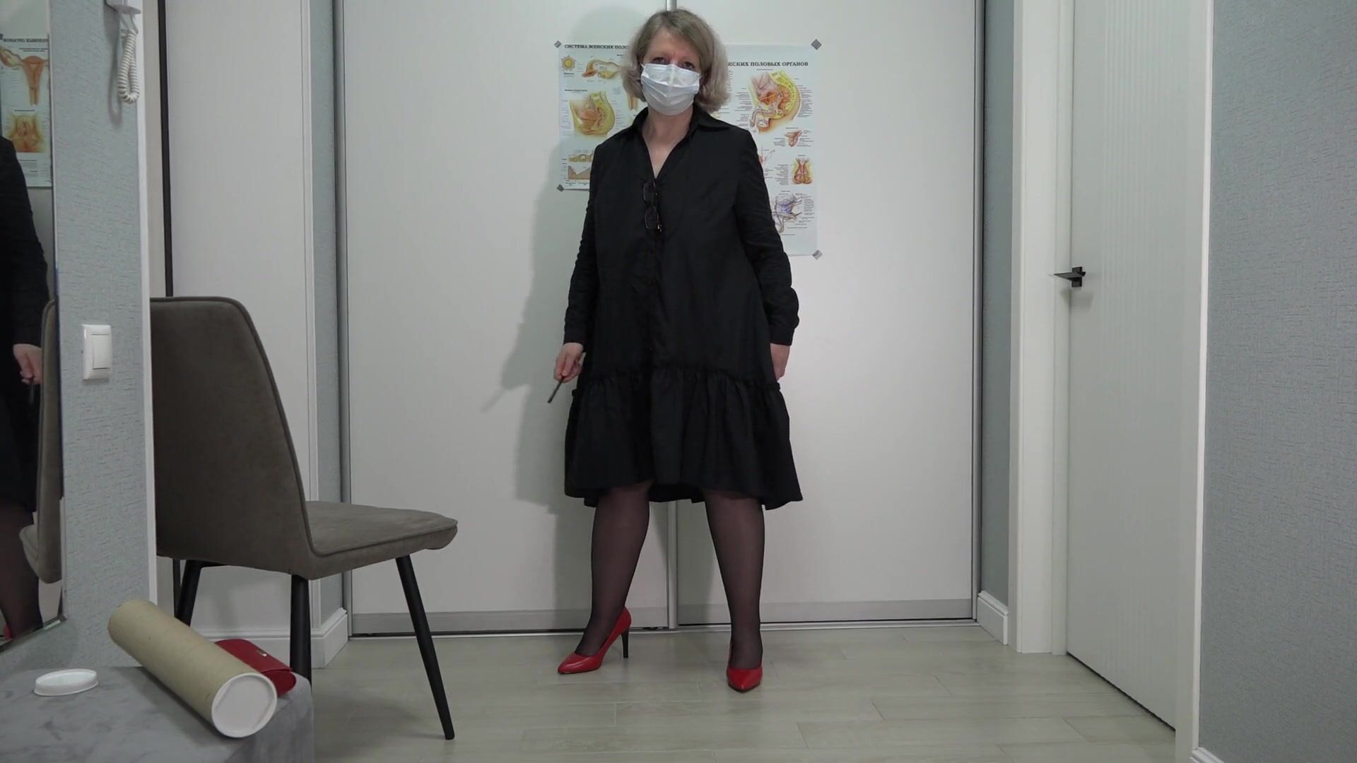 . A curvy teacher in a dress, black nylon stockings, high heels, glasses and a mask. In an anatomy lesson, she tells students about the interaction of the female and male reproductive systems and the process of reproduction. And the students at this time imagine how they fuck this busty milf. Have you dreamed of fucking your mature teacher? Dildo fucks shaved pussy in different positions, while big ass shakes sexy. Amateur solo role play. Hot blonde with a juicy gorgeous butt. PAWG. Fetish. BBW.