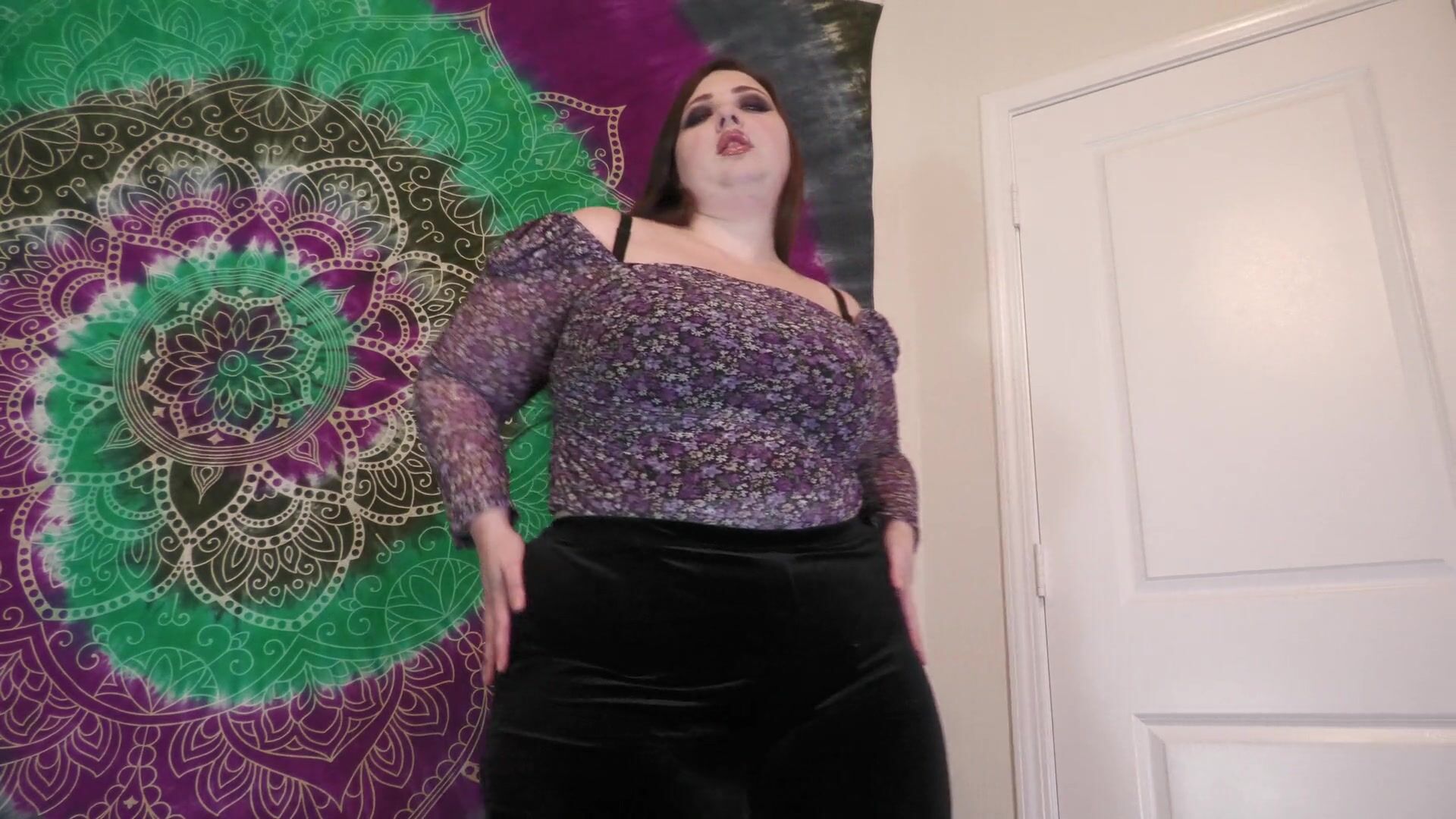 . A chubby bbw strips out of her lingerie to show off her tits, belly, and ass. Then she instructs you on how she wants you to jerk off. She shows off her massive tits and huge ass up close to the camera to help you cum and then shows her massive bush and pussy off the the camera.