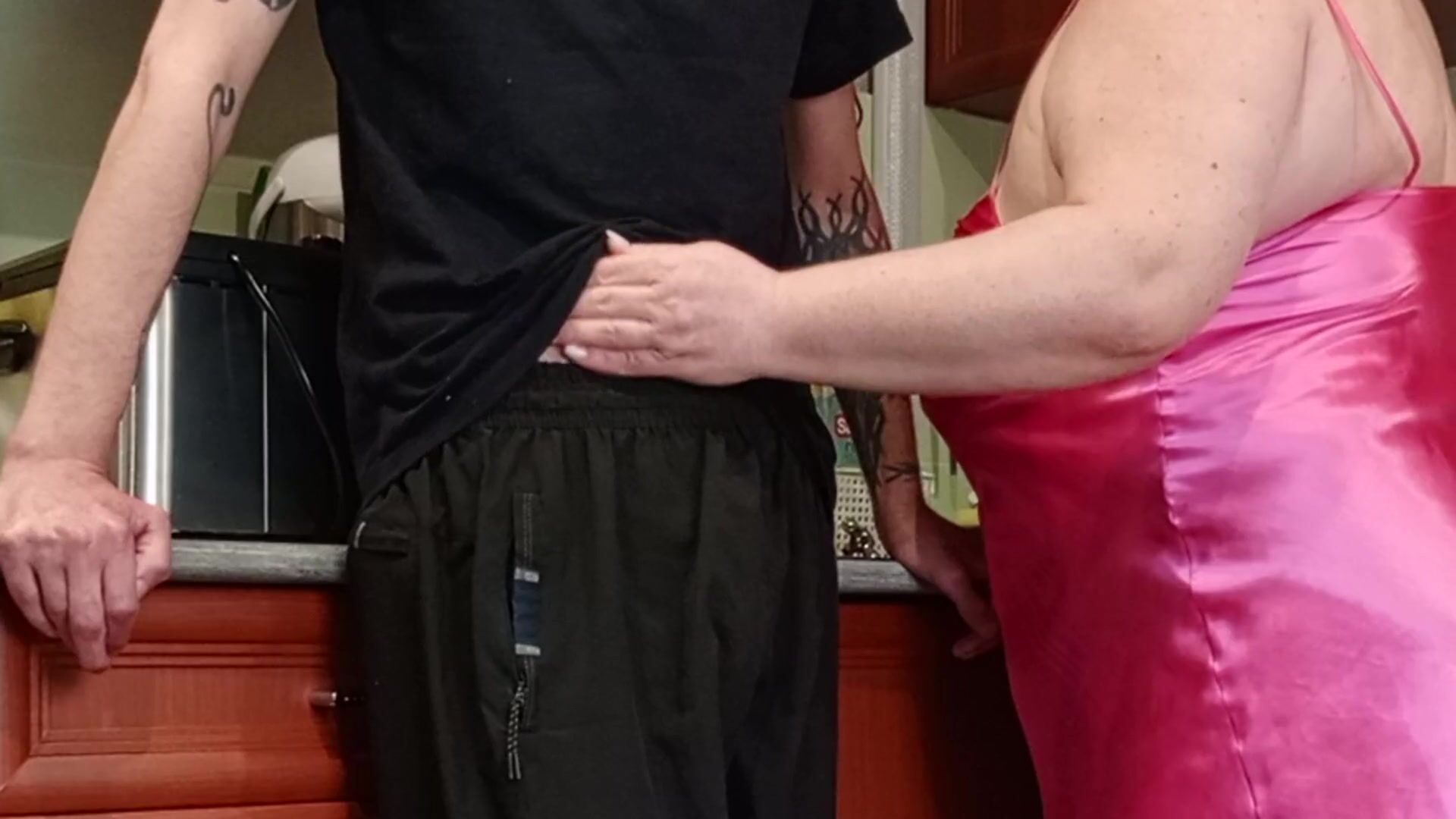 IN THE KITCHEN, THE STEPMOM SUCKS OFF A DICK, JERKS IT OFF AND WATCHES THE SPERM